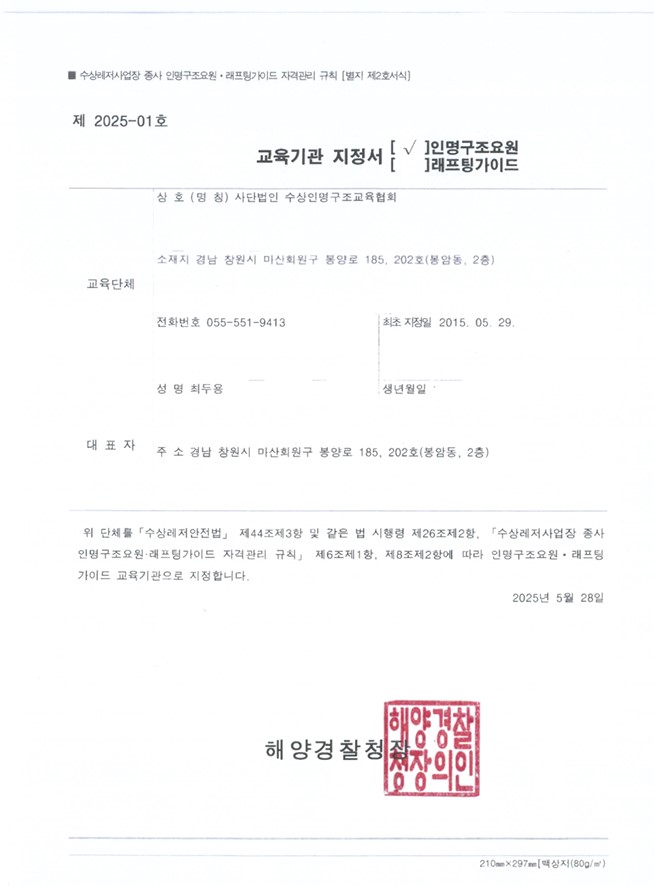 인명구조요원 지정서 페이지 정보 작성자 관리자 댓글 0건 조회 844회 작성일 19-04-15 09:24 본문 인명구조요원 지정서 목록 이전글사업자등록증 19.04.15 다음글수상구조사 교육기관 지정서 19.04.15