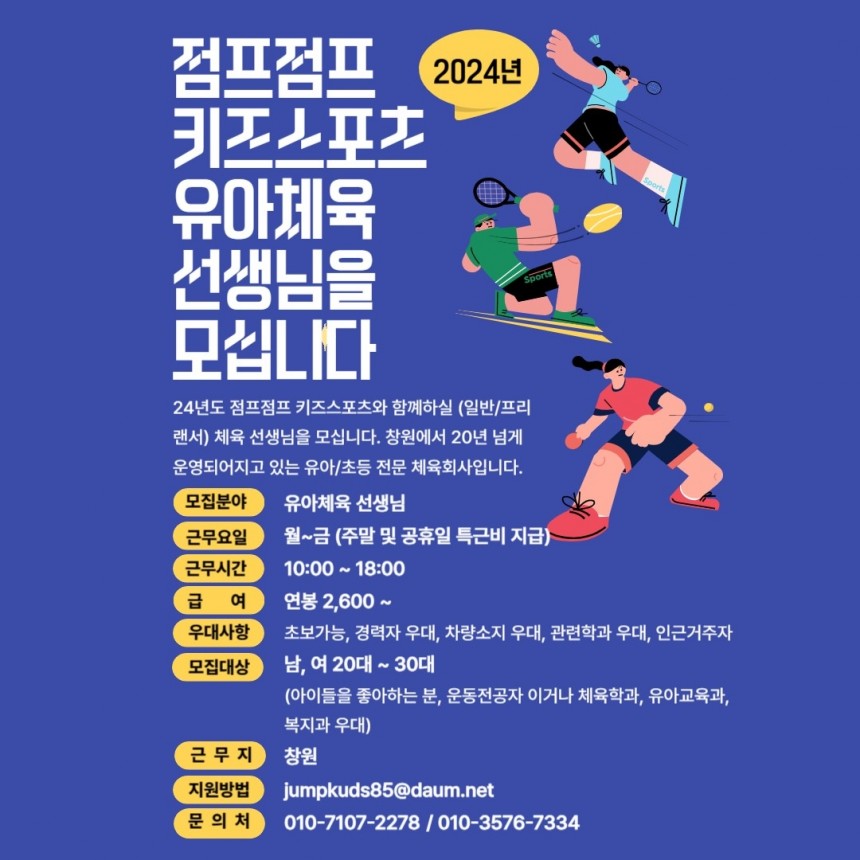 공지 창원) 점프점프 키즈스포츠 유아체육 선생님을 모십니다. 페이지 정보 작성자 교육부1 댓글 0건 조회 2,786회 작성일 24-01-24 16:24 본문 창원) 점프점프 키즈스포츠 유아체육 선생님을 모십니다. 목록 답변 글쓰기 이전글창녕군시설관리공단 직원채용관련 인재 추천의뢰 건 24.02.01 다음글노블스위밍랩 2024상반기 정규직 채용공고 24.01.12 댓글목록 댓글목록 등록된 댓글이 없습니다.