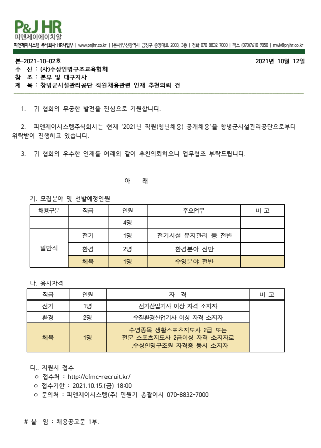 구인 창녕군시설관리공단 페이지 정보 작성자 총무부 댓글 0건 조회 2,811회 작성일 21-10-12 10:14 본문 채용공고 첨부파일 채용공고_창녕군시설관리공단.pdf (44.0K) 31회 다운로드 | DATE : 2021-10-12 10:14:21 목록 답변 글쓰기 이전글(완료)채용공고 21.10.13 다음글아이푸른어린이수영장 청주 지웰점 21.09.14 댓글목록 댓글목록 등록된 댓글이 없습니다.