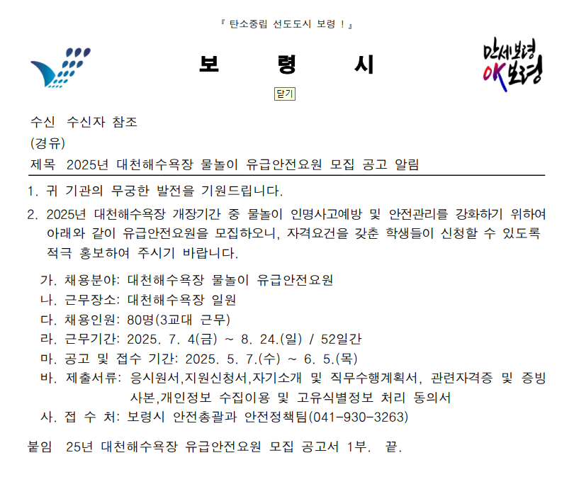 공지 2025년 대천해수욕장 물놀이 유급안전요원 모집 공고