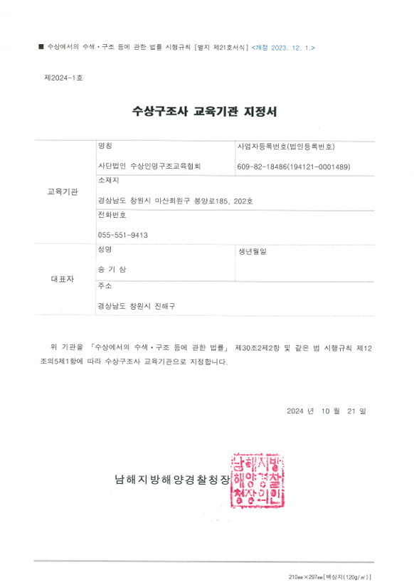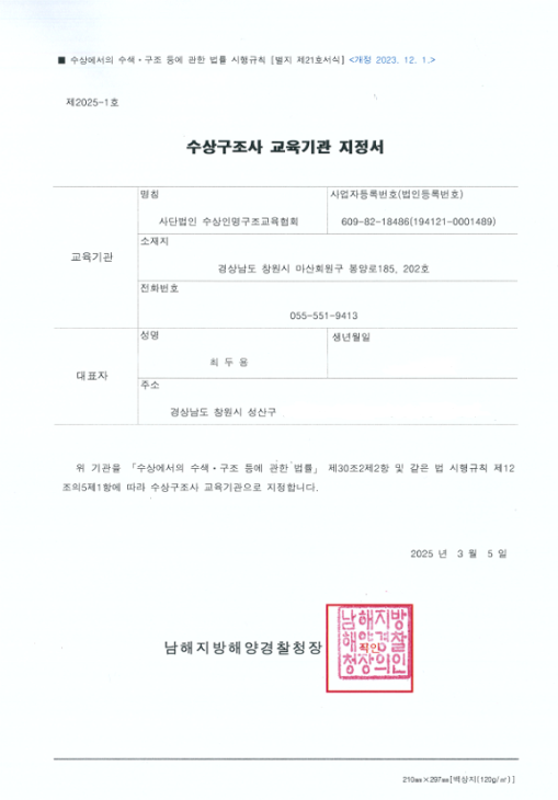 수상구조사 교육기관 지정서 페이지 정보 작성자 관리자 댓글 0건 조회 783회 작성일 19-04-15 09:24 본문 수상구조사 교육기관 지정서 목록 이전글인명구조요원 지정서 19.04.15 다음글민간자격등록증-강사 19.04.15