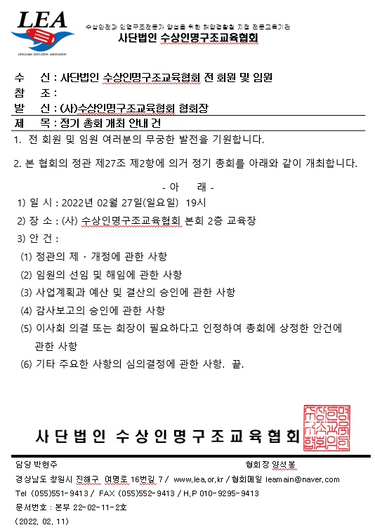 본회 정기총회 개최 안내 페이지 정보 작성자 사무국1 댓글 0건 조회 2,544회 작성일 22-02-11 15:16 본문 상기와 같이 정기총회를 개최합니다. 많은 관심 바랍니다. 목록 이전글2022년 거제시 해수욕장 안전관리요원 배치 전 교육 일정 공지 22.06.14 다음글『 해양레포츠 교육비 지원』사업공고 22.02.11