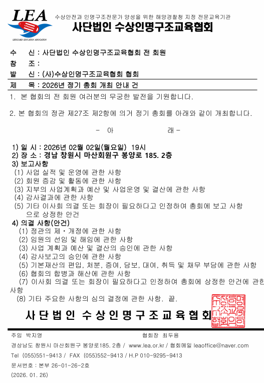 공지 26년 정기 총회 개최 안내 페이지 정보 작성자 총무부 댓글 0건 조회 402회 작성일 26-01-26 11:19 본문 협회의 모든 회원은 바쁜 일정이시더라도 많은 참석과 관심을 가져주시면 감사하겠습니다. 목록 이전글2026년 교육비인상 안내 26.01.27 다음글25년 정기 총회 개최 안내 25.02.14