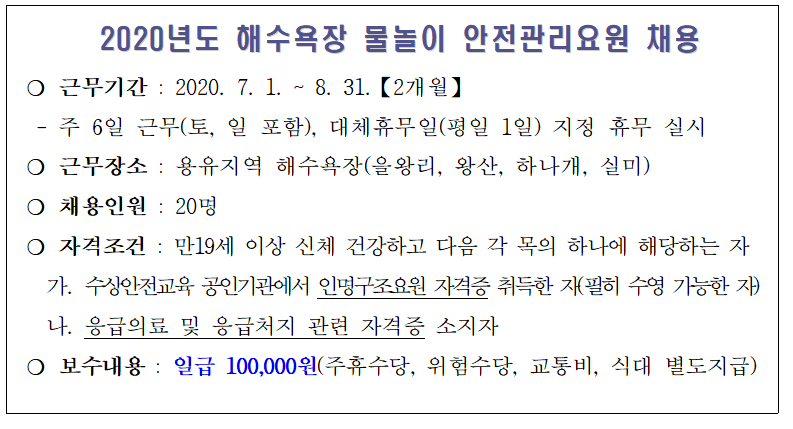 구인 2020년도 해수욕장 물놀이 안전관리요원채용